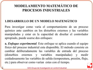 Este documento describe los conceptos fundamentales del modelado matemático de procesos industriales para el control de procesos. Explica dos enfoques para modelar procesos (experimental y teórico) y la necesidad de modelado matemático para el diseño de controladores. También define variables y ecuaciones de estado, y conceptos como grados de libertad y modelos de entrada-salida, ilustrando con ejemplos de un tanque de calentamiento.
