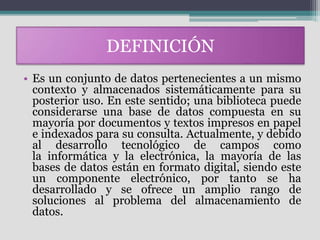 Este documento describe los componentes básicos de una base de datos, incluyendo sus características, ventajas y el sistema de gestión de base de datos. Una base de datos almacena datos de manera sistemática para su uso futuro, y las bases de datos digitales son ahora comunes. Las bases de datos brindan integridad y seguridad de datos, así como acceso simultáneo a la información.