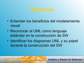 El documento habla sobre modelado visual y UML. Explica los beneficios del modelado visual y reconoce a UML como el lenguaje estándar para la construcción de software. Identifica varios diagramas UML y su uso durante el desarrollo de software. También describe el proceso de modelado de negocios, incluyendo la creación de una visión del negocio, objetivos, reglas, glosario y casos de uso.