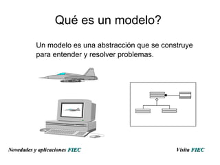 Este documento describe el modelado orientado a objetos y el Lenguaje de Modelado Unificado (UML). Explica que un modelo es una abstracción que se construye para entender y resolver problemas, y que los modelos se construyen para reducir la complejidad, comunicar ideas, probar sistemas antes de construirlos y documentar decisiones. Luego describe que el modelado orientado a objetos usa objetos como bloques de construcción y UML como lenguaje para crear los modelos, y resume brevemente la historia y propósito de UML.