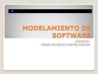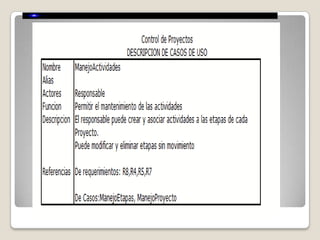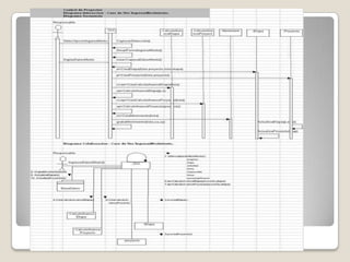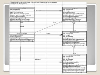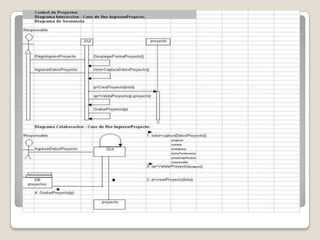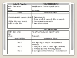 El documento describe el modelado de un sistema de administración de proyectos de desarrollo utilizando UML. UML proporciona nueve diagramas para modelar sistemas, incluidos diagramas de casos de uso, clases, secuencia y estado. El ejemplo modela un sistema para administrar proyectos de desarrollo a través de varios diagramas UML.