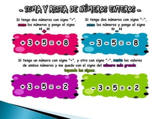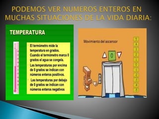 Este documento describe los números enteros, incluidas sus características, representación, operaciones básicas como suma, resta, multiplicación y división, y reglas para combinar operaciones. Explica cómo multiplicar y dividir números enteros siguiendo pasos específicos y proporciona ejemplos. También menciona que las raíces cuadradas de números negativos no tienen solución en los números reales y son números imaginarios. Finalmente, incluye gráficos sobre los resultados de una encuesta relacionada con conceptos de números enteros.