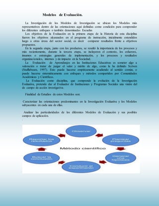 Este documento presenta el modelo de evaluación de Edward A. Suchman, quien creía que la evaluación debía seguir el método científico. Describe las características del enfoque analítico-racionalista de Suchman, incluyendo que la evaluación es un proceso científico para determinar el éxito de un programa mediante el uso de técnicas investigativas. También explica la metodología de Suchman que involucra la identificación de valores, definición de metas, selección de criterios y evaluación del efecto de las actividades en