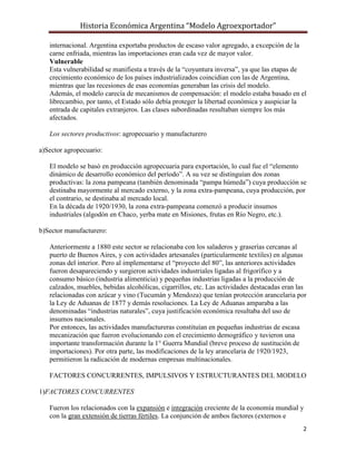 El modelo agroexportador argentino se basó en la producción y exportación de productos agropecuarios primarios para satisfacer la demanda de Gran Bretaña. Se caracterizó por ser abierto, dependiente y vulnerable a los ciclos económicos de los países desarrollados. El modelo se sustentó en la expansión de las exportaciones agrícolas, el capital extranjero (especialmente en ferrocarriles y frigoríficos), y la inmigración masiva que satisfizo la falta de mano de obra. Sin embargo, también generó una economía