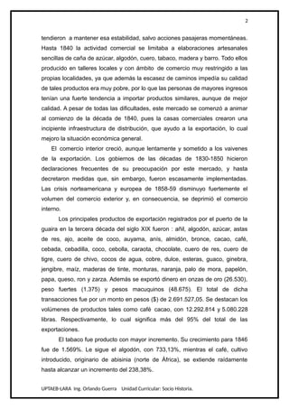 1. El comercio interno y externo de Venezuela creció en el siglo XIX debido al aumento de la población y la demanda externa de productos venezolanos. Sin embargo, la guerra de independencia causó inestabilidad económica y la desaparición de transacciones y capitales comerciales.