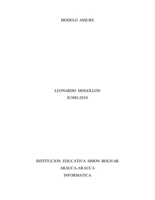 El documento presenta el modelo ASSURE para el diseño de instrucción. El modelo consiste en 6 pasos: 1) Análisis de los estudiantes, 2) Establecimiento de objetivos, 3) Selección de métodos y materiales, 4) Utilización de los materiales, 5) Participación de los estudiantes, y 6) Evaluación y revisión. El modelo ayuda a los maestros a diseñar lecciones efectivas considerando las características de los estudiantes y asegurando su participación activa.