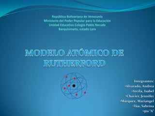 El documento describe el modelo atómico propuesto por Ernest Rutherford en 1911, en el que propuso que el átomo está formado por un núcleo central muy pequeño donde se concentra la masa y carga positiva, rodeado por electrones que orbitan en una "corteza" externa. Este modelo se basó en los resultados del experimento de Rutherford donde partículas alfa rebotaban después de golpear una lámina de oro, lo que indicaba la presencia de una región densamente cargada en el centro del átomo. El modelo de Rutherford superó la idea de