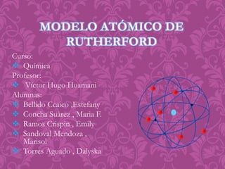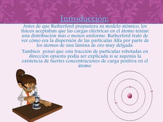 El documento presenta el modelo atómico de Ernest Rutherford, quien propuso un modelo planetario del átomo en 1911, donde la masa y carga positiva se concentran en un núcleo, mientras que los electrones giran en órbitas. Rutherford realizó importantes experimentos, incluyendo el de la lámina de oro, que llevaron a la comprensión del núcleo, desafiando ideas previas sobre la estructura atómica. A pesar de sus contribuciones, el modelo de Rutherford enfrenta desventajas relacionadas con la estabilidad de los electrones en órbita.