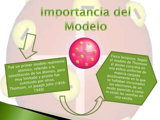 El modelo atómico de Thomson proponía que los átomos estaban compuestos por electrones distribuidos uniformemente en una esfera de carga positiva, similar a un pastel de frutas. Este modelo explicaba algunos hechos observados en la química y los rayos catódicos, pero hacía predicciones incorrectas sobre la distribución de la carga positiva en el átomo.