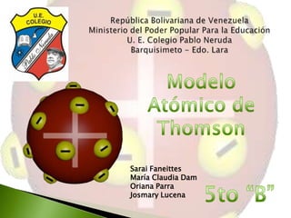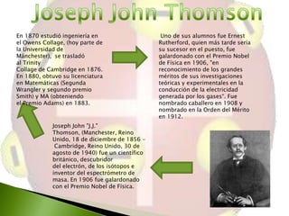 El documento describe el modelo atómico de J.J. Thomson, en el cual propuso que los átomos estaban compuestos por electrones distribuidos uniformemente dentro de una esfera de carga positiva, similar a un budín de pasas. Este modelo fue el primero en proponer una estructura interna del átomo y ayudó a explicar los resultados de los experimentos con rayos catódicos de la época. Sin embargo, no podía explicar completamente la distribución de la carga eléctrica en el átomo.