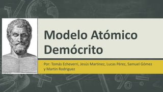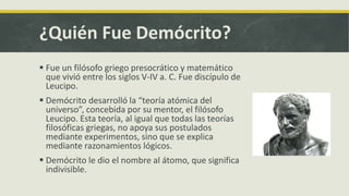 Demócrito fue un filósofo griego del siglo V-IV a.C. que desarrolló la teoría atómica del universo, proponiendo que toda la materia está compuesta de átomos indivisibles que varían solo en forma y tamaño, y que las propiedades de la materia dependen del agrupamiento de los átomos.