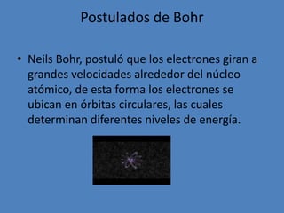 El modelo atómico de Bohr postuló que los electrones giran en órbitas circulares definidas alrededor del núcleo atómico, absorbiendo o emitiendo energía al cambiar de órbita. Bohr basó su modelo en el átomo de hidrógeno, con un protón y un electrón girando en su alrededor en órbitas cuantizadas que determinan los diferentes niveles de energía del átomo.