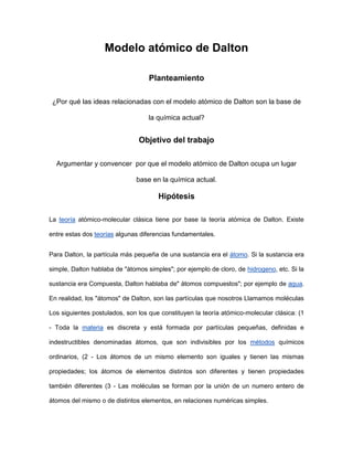 El documento presenta el modelo atómico de Dalton. Explica que Dalton propuso que toda la materia está compuesta de átomos indivisibles y que los átomos de cada elemento son iguales entre sí pero diferentes de los de otros elementos. También describe las características principales del modelo atómico de Dalton, como que los átomos se combinan en proporciones simples para formar compuestos químicos. El documento concluye que el modelo atómico de Dalton sentó las bases para la química moderna al introducir las ideas sobre la naturaleza de