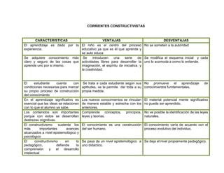 Este documento describe las características, ventajas y desventajas de las corrientes constructivistas en educación. Según el constructivismo, el aprendizaje se da por la experiencia del estudiante y no por la autoridad, lo que permite que el estudiante construya su propio conocimiento. Sin embargo, este enfoque puede no promover el aprendizaje de conocimientos fundamentales o identificar leyes naturales. El documento también presenta principios pedagógicos y epistemológicos constructivistas, como que el conocimiento es una construcción individual y no una