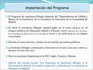 El programa de colegios bilingües de la Comunidad de Madrid comenzó en 2004 en 26 colegios públicos y se ha expandido a incluir 340 colegios públicos y 64 institutos. El programa requiere que los maestros reciban formación y acrediten su competencia en inglés, e implementa un enfoque de aprendizaje integrado de contenidos y lenguaje para impartir al menos el 30% del plan de estudios en inglés.