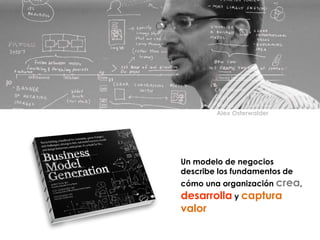 El documento describe los 9 bloques de construcción del modelo de negocios Canvas. Cada bloque representa un elemento clave del modelo de negocios y describe cómo una organización crea, desarrolla y captura valor. Los 9 bloques son: segmentos de clientes, propuesta de valor, canales, relación con clientes, flujos de ingresos, recursos clave, actividades clave, red de partners y estructura de costos. El modelo Canvas ayuda a las organizaciones a describir, diseñar, evaluar y modificar sus modelos de negocios.