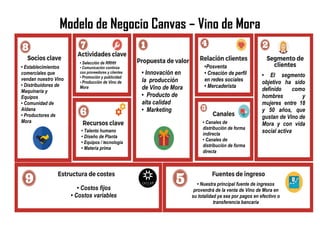 El documento describe el modelo de negocio de una empresa de vino de mora. La empresa se enfocará en la producción y venta de vino de mora de alta calidad dirigido a hombres y mujeres entre 18 y 50 años. Generará ingresos principalmente a través de la venta directa e indirecta de su vino de mora.