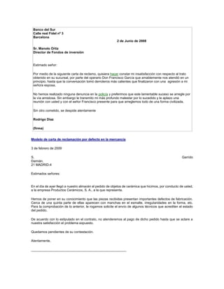 El Sr. Rodrigo Díaz escribe una carta de queja al director de fondos de inversión del Banco del Sur sobre un incidente desagradable que ocurrió con un empleado del banco, el Sr. Francisco García, durante una visita a la sucursal. El Sr. García se puso agresivo durante la conversación y agredió a la esposa del Sr. Díaz. El Sr. Díaz pide una reunión con el director y el Sr. García para resolver el asunto de manera civilizada.