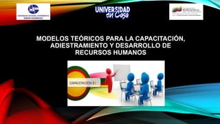 El documento aborda los modelos teóricos para la capacitación, adiestramiento y desarrollo de recursos humanos, resaltando su importancia como herramientas para la transmisión de información y modificación de actitudes. Se describe un modelo clásico que incluye etapas como detección de necesidades, planificación, ejecución y evaluación, cada una con sus propias características y preguntas clave. La capacitación es presentada como un proceso sistemático que facilita la adquisición de conocimientos y habilidades en función de objetivos definidos.