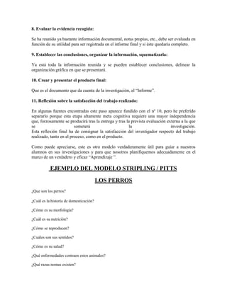 Este modelo de investigación consta de 11 pasos que guían a estudiantes en la realización de proyectos de investigación. Los pasos incluyen elegir un tema amplio, obtener una perspectiva global, acotar el tema, desarrollar una tesis, formular preguntas, planear la investigación, encontrar y analizar fuentes, evaluar la evidencia, establecer conclusiones y crear un producto final. El modelo provee una estructura para que los estudiantes desarrollen habilidades de investigación.