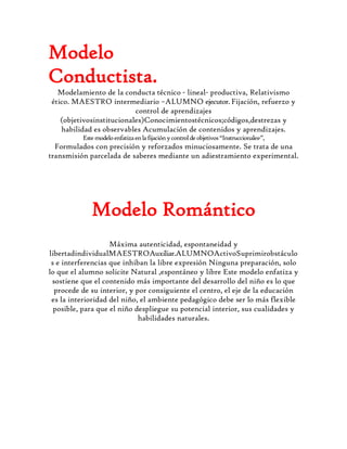 Este documento presenta resúmenes de cuatro modelos educativos: el conductista, el romántico, el desarrollista y el socialista. El modelo conductista se enfoca en la transmisión de conocimientos técnicos a través de objetivos e instrucciones precisos y el refuerzo de aprendizajes. El modelo romántico promueve la espontaneidad, libertad y expresión individual del estudiante. El modelo desarrollista busca que los estudiantes accedan a estructuras cognitivas superiores según su desarrollo biológ