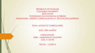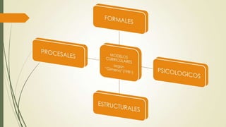 Este documento presenta una introducción a los modelos curriculares, definiendo un modelo curricular como una recopilación de teorías pedagógicas que orientan el diseño de programas de estudio. Luego describe varios modelos curriculares formales, psicológicos, estructurales y procesuales. Entre los modelos específicos discutidos se encuentran el modelo de Tyler de 1949, el modelo de Johnson de 1977 y el modelo del hexágono curricular. Finalmente, menciona brevemente los modelos clásicos, conductistas y constructivistas