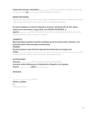 Este documento presenta un modelo de acción de tutela en Colombia. En él se identifica al accionante, al accionado y los hechos que originan la vulneración de derechos. Se especifican los derechos amenazados y la petición de tutelarlos, ordenando una medida a la autoridad involucrada. Adicionalmente, se solicita una medida provisional dada la urgencia del caso y se aportan pruebas y direcciones para notificaciones.