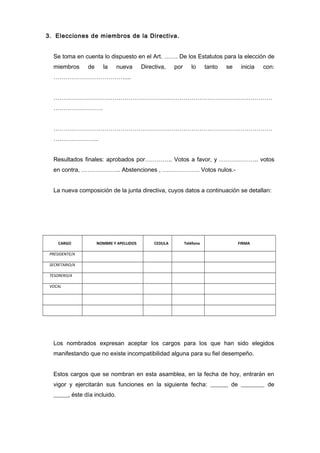 Este documento es el acta de una asamblea general de socios de la Asociación de Comunicadores "Eugenio Espejo" de Sucumbíos. La asamblea tuvo lugar en la ciudad de Nueva Loja para elegir una nueva directiva de la asociación. Se eligió una nueva junta directiva con cargos como presidente, secretario y tesorero. La nueva directiva asumirá sus funciones a partir de una fecha determinada según los estatutos de la asociación.