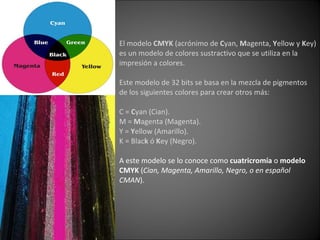 El modelo CMYK es un modelo de color sustractivo utilizado en impresión que mezcla pigmentos cian, magenta, amarillo y negro. Se basa en la absorción de luz, donde cada color absorbe una parte del espectro de luz visible. A diferencia del modelo RGB usado en pantallas, CMYK no puede reproducir todos los colores debido a limitaciones en la mezcla de pigmentos de tinta. La conversión entre modelos RGB y CMYK no es perfecta y puede afectar la apariencia del color.