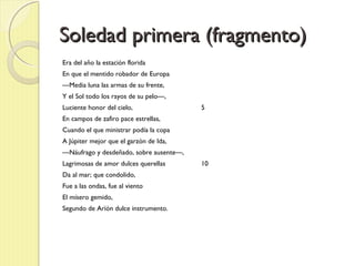 Este fragmento pertenece al poema inacabado "Soledades" de Luis de Góngora, poeta barroco español. En los primeros siete versos se describe el paisaje primaveral y la situación de los astros mitológicos. Los siguientes versos narran que el protagonista, un náufrago, se queja de amor al mar con un lamento comparable al de Arión. El lenguaje culto y hermético de Góngora utiliza numerosas figuras literarias como metáforas, hipérbatos y cult