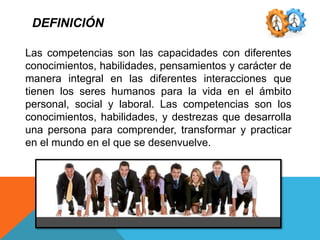 Las competencias son capacidades integrales que permiten a las personas interactuar efectivamente en diferentes ámbitos de la vida. Se dividen en competencias generales, necesarias para cualquier empleo, y competencias específicas, requeridas para roles particulares. En el contexto de la gerencia de recursos humanos, se destacan habilidades como entendimiento del negocio, credibilidad, liderazgo, manejo de conflictos y toma de decisiones complejas.