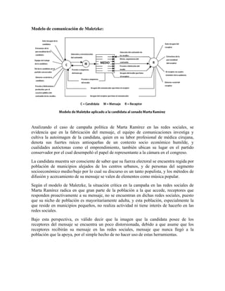 El documento analiza la campaña política de Marta Ramírez en las redes sociales utilizando el modelo de comunicación de Maletzke. Se describe que el equipo de comunicaciones de Ramírez investigó su autoimagen de médica cirujana de origen humilde y conservadora para fabricar su mensaje. Aunque Ramírez asume que su base electoral se encuentra en municipios alejados y personas de bajos ingresos, gran parte de esta población no usa redes sociales. Por lo tanto, según el modelo de Maletzke, la situación crítica es que su mensaje no llegó