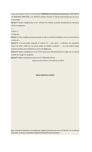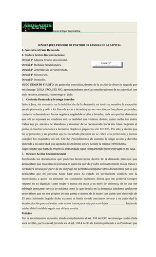 El documento es una respuesta a una demanda de divorcio donde el demandado, Hugo Sensato, niega las acusaciones de su cónyuge Zoila Vaca y presenta una acción reconvencional. Alega haber sido víctima de malos tratos y solicita la disolución del vínculo matrimonial, así como asistencia familiar para sus hijos. Además, incluye medidas provisionales y detalla la documentación pertinente para su defensa.