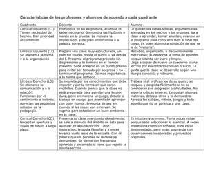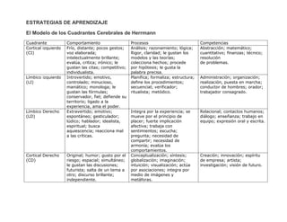 El documento presenta el Modelo de los Cuadrantes Cerebrales de Herrmann, el cual divide el cerebro en cuatro cuadrantes - Cortical izquierdo, Límbico izquierdo, Límbico derecho y Cortical derecho - y describe las características de procesamiento de información, competencias y estilos de enseñanza y aprendizaje asociados a cada cuadrante.