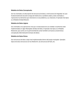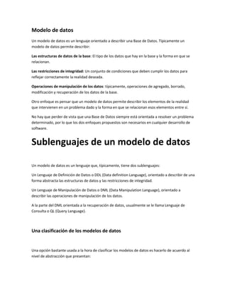 Un modelo de datos permite describir las estructuras de datos de una base de datos, las restricciones de integridad, y las operaciones de manipulación de datos. Un modelo de datos también permite describir los elementos de la realidad involucrados en un problema y cómo se relacionan. Un modelo de datos típicamente tiene dos sublenguajes: un lenguaje de definición de datos y un lenguaje de manipulación de datos.