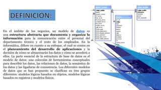 Un modelo de datos documenta y organiza la información en el ámbito empresarial y se centra en la estructura de las bases de datos, incluyendo modelos lógicos y físicos. Los distintos modelos de datos, como el relacional, de red y jerárquico, permiten describir cómo se organizan y acceden los datos, así como las operaciones que se pueden realizar sobre ellos. La comprensión de estos modelos y su implementación es crucial para el desarrollo de software y la gestión de bases de datos en el entorno laboral.