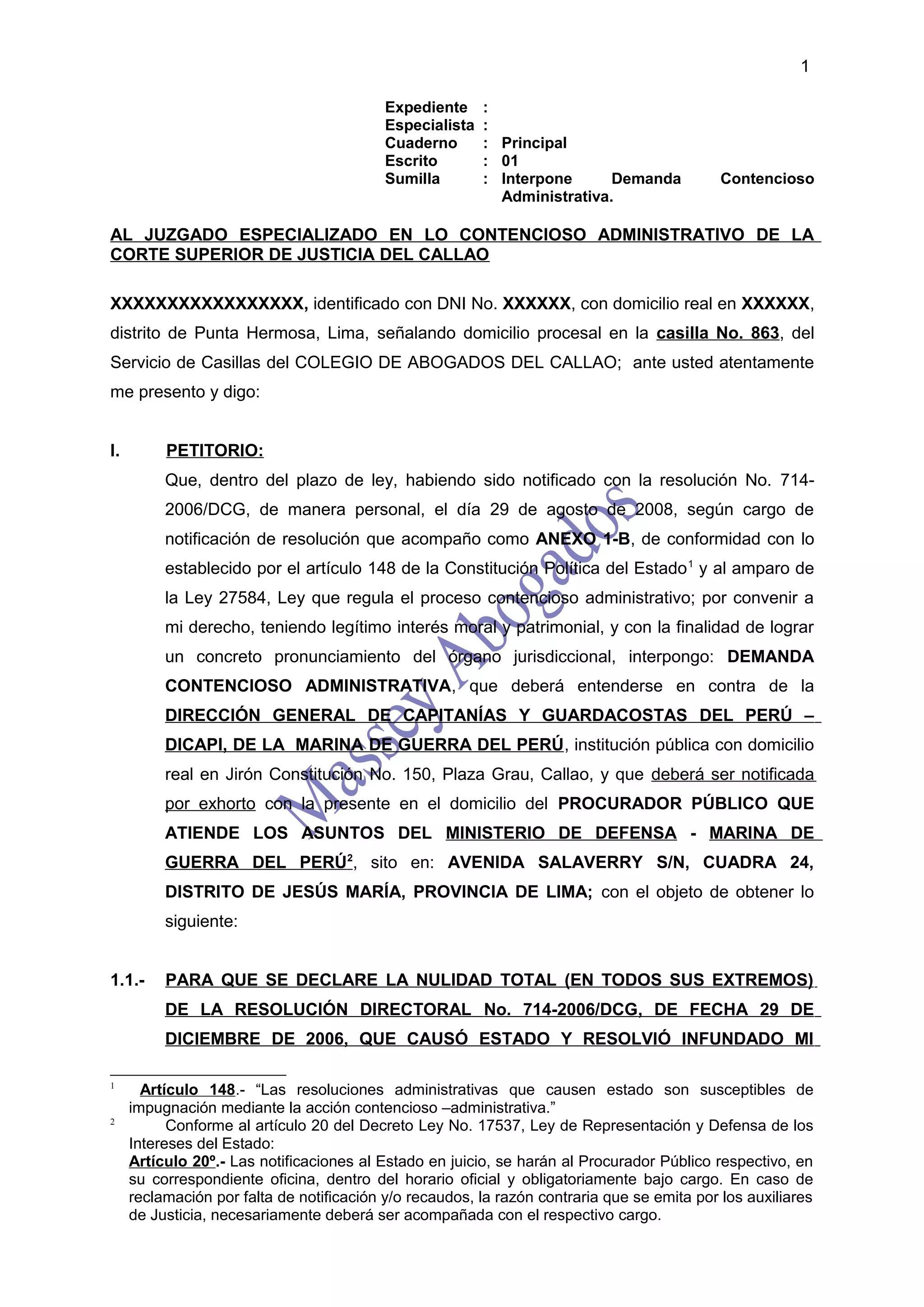 Este documento presenta una demanda contencioso administrativa contra la Dirección General de Capitanías y Guardacostas de Perú (DICAPI) para anular una resolución que impuso una multa excesiva. El demandante argumenta que (1) la resolución fue emitida por un órgano incompetente, (2) la multa se basó en hechos falsos, y (3) el área donde ocurrió el incidente estaba fuera de la jurisdicción de la DICAPI. Pide que se anule la resolución y la multa impuesta.