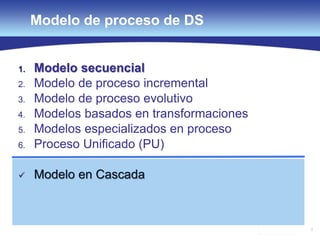 El documento presenta diferentes modelos de desarrollo de software, incluyendo el modelo en cascada, incremental, de desarrollo rápido de aplicaciones y evolutivo. Cada modelo se evalúa en términos de sus fases, ventajas y desventajas, destacando la importancia de la especificación de requisitos y la gestión de riesgos. Se discuten también herramientas CASE que facilitan el proceso de desarrollo, enfatizando la reutilización y una adecuada planificación.