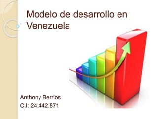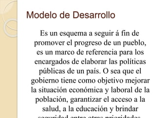 Este documento describe diferentes modelos de desarrollo, incluyendo el modelo endógeno y el modelo de desarrollo venezolano. El modelo endógeno promueve el desarrollo desde dentro de la comunidad a través del liderazgo y la participación comunitaria. El modelo de desarrollo venezolano busca lograr la independencia, igualdad y justicia social garantizando el acceso a necesidades básicas. Sus directrices principales incluyen ser ético y centrarse en la felicidad social colectiva.