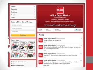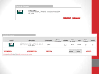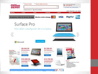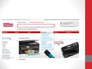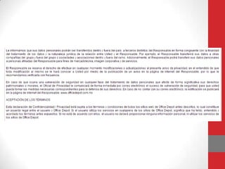 El documento proporciona información sobre las políticas de pago y uso de Office Depot, detallando métodos de pago aceptados, condiciones para cheques, y procesos de autorización de depósitos. También establece términos de uso del servicio, derechos de propiedad intelectual, y políticas comerciales y de privacidad. Incluye información de contacto para atención al cliente y apoyo en compras en línea.
