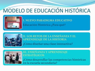 El documento presenta un modelo de educación histórica enfocado en la enseñanza interactiva y el desarrollo de competencias históricas en los estudiantes de secundaria. Se aborda la importancia de las fuentes históricas y las actividades prácticas, como talleres de museografía, periodismo y dramatización, para fomentar el aprendizaje colaborativo y la conciencia histórica. Se concluye que el rol del educador es facilitar comunidades de aprendizaje en lugar de ser un simple transmisor de conocimiento.