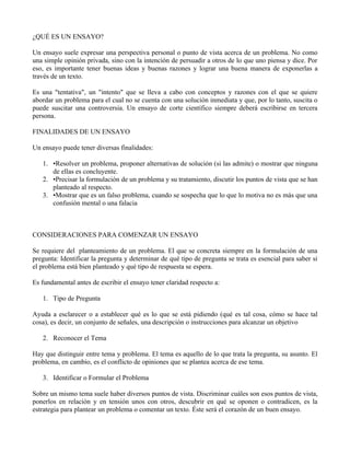 Este documento explica qué es un ensayo, sus finalidades y componentes. Un ensayo expresa una perspectiva personal sobre un tema con el objetivo de persuadir. Debe tener buenos argumentos y exponerlos de manera clara y coherente. Un ensayo puede resolver un problema, proponer soluciones o mostrar que ninguna es concluyente. Debe contener una introducción, desarrollo y conclusión. La introducción presenta el tema y la pregunta a responder. El desarrollo analiza el tema con argumentos y ejemplos. La conclusión resume