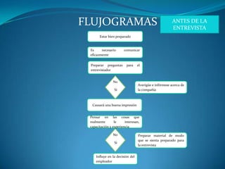 El documento presenta información sobre la preparación para entrevistas de trabajo. Resalta la importancia de investigar sobre la compañía, preparar preguntas para el entrevistador, pensar en las habilidades relevantes, y dar ejemplos concretos de experiencia. También recomienda enviar una nota de agradecimiento después de la entrevista para mostrar continuo interés en el puesto.