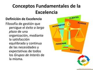Este documento describe los conceptos fundamentales del Modelo de Excelencia EFQM. Explica que la excelencia se refiere a lograr el éxito a largo plazo de una organización mediante la satisfacción equilibrada de las necesidades de todos sus grupos de interés. Describe los valores de la excelencia, los criterios del modelo y el esquema lógico REDER para evaluar a las organizaciones. El modelo ayuda a identificar fortalezas y áreas de mejora para lograr resultados sobresalientes de forma sostenida.