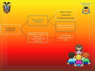 El documento describe varios aspectos de la evaluación estudiantil y el refuerzo académico. Explica que la evaluación debe ser un proceso continuo que incluye observación, valoración y evidencia de logros, con sistemas de retroalimentación para mejorar la enseñanza. También cubre tipos de evaluación, acciones para evaluar logros de aprendizaje, formulación de problemas después de evaluar, modelos de calificación y retroalimentación apreciativa.