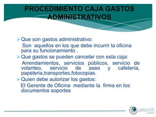 Este documento describe los procedimientos relacionados con la caja menor de una cooperativa. Explica qué es la caja menor, los gastos administrativos que se pueden pagar con ella, y quién debe autorizarlos. También detalla los requisitos de los documentos soporte y cómo ingresar la información de la caja menor en el sistema EasySoft.