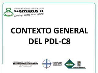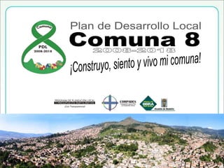 El documento presenta el Plan de Desarrollo Local de la Comuna 8 en Medellín, el cual se desarrolló en 3 fases entre 2007-2010. Tuvo como visión convertir la comuna en un territorio con desarrollo integral sostenible y calidad de vida para sus habitantes para 2018. Se basó en principios de derechos humanos, desarrollo humano integral y participación ciudadana a través de un Consejo de Planeación y Gestión Local.