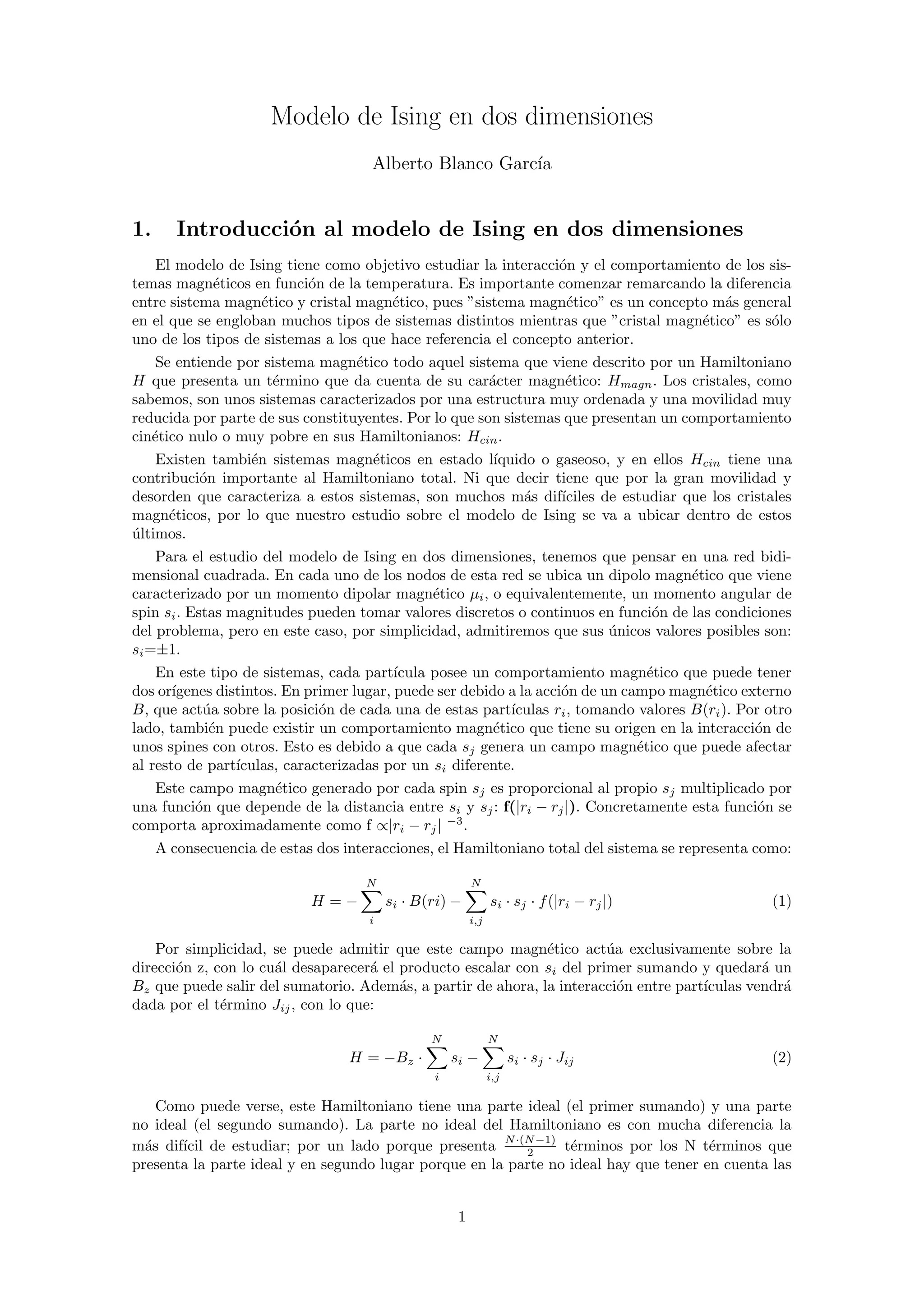 El modelo de Ising en dos dimensiones se utiliza para estudiar sistemas magnéticos y su comportamiento en función de la temperatura, analizando la interacción entre dipolos magnéticos en una red cuadrada. Se presenta el formalismo de la matriz de transferencia como una herramienta para calcular la función de partición y magnitudes físicas relevantes, facilitando el estudio de estos sistemas complejos. La práctica se divide en secciones que abordan tiempos de autocorrelación y otros aspectos, combinando conocimientos físicos y programación para realizar simulaciones.