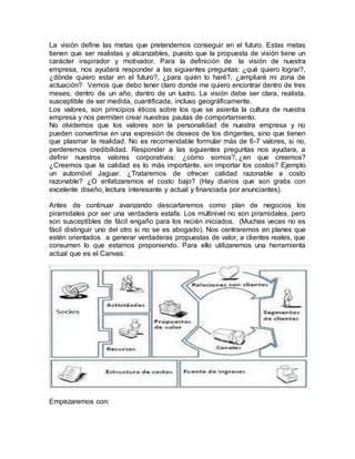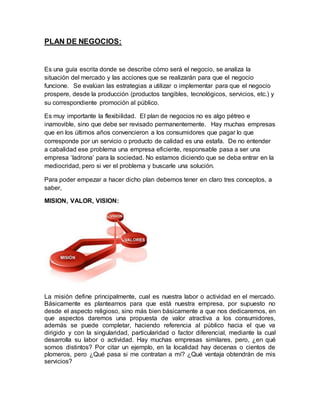 El plan de negocios describe cómo será el negocio, analiza el mercado y las estrategias para que prospere. Incluye conceptos clave como misión, visión y valores, así como análisis del mercado objetivo, propuesta de valor, canales de distribución, fuentes de ingresos y estructura de costos. El plan debe ser flexible y revisado periódicamente para adaptarse a los cambios en el mercado.