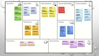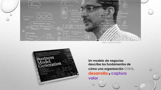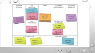 El documento describe los 9 bloques de construcción del modelo de negocios Canvas. Cada bloque representa un elemento clave del modelo de negocios y describe cómo una organización crea, desarrolla y captura valor. Los 9 bloques son: segmentos de clientes, propuesta de valor, canales, relación con clientes, flujos de ingresos, recursos clave, actividades clave, red de partners y estructura de costos. Juntos, estos 9 bloques proporcionan una representación completa del modelo de negocios de una organización.